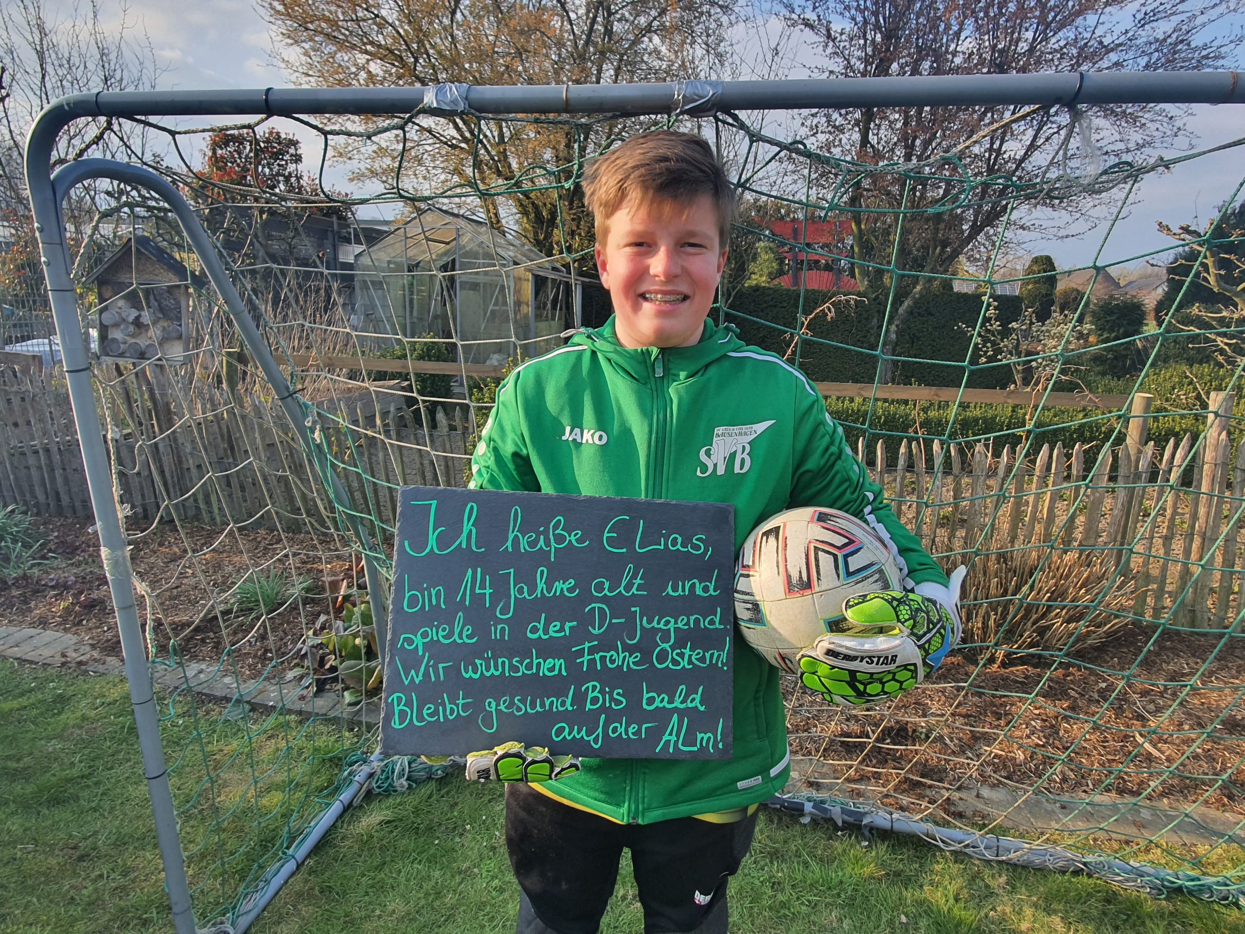 “Luca; 10 Jahre; E-Jugend: „Fußball an der Playstation wird irgendwann langweilig. Zum Glück haben wir einen großen Garten. Ich wünsche allen Sportlern, Freunden und Fans vom SV Bausenhagen ein frohes Osterfest und eine gute, gesunde Zeit.“