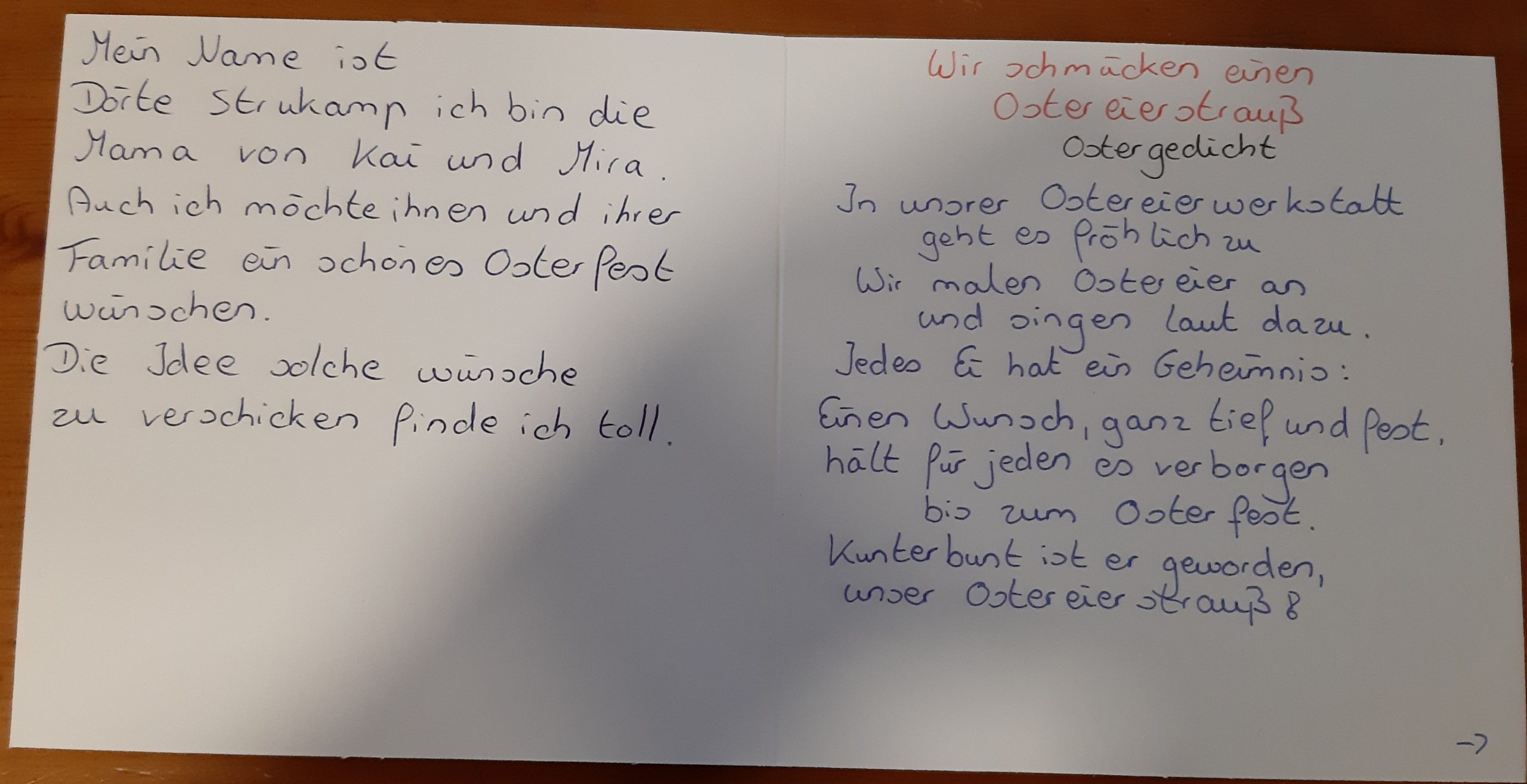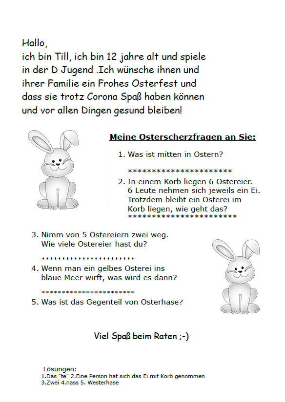 „Hallo, ich heiße Julian und ich bin 12 Jahre alt. Ich spiele in der D-Jugend und vermisse meine Kumpels sehr. Ich wünsche Ihnen allen Gesundheit und ein tolles Osterfest.“